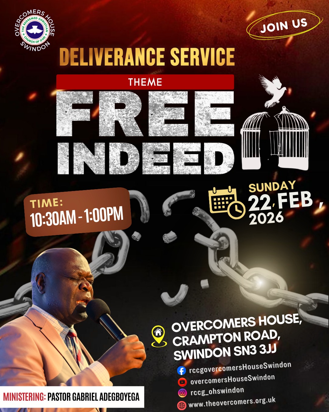 Featured Featured February 22 @ 10:30 am - 1:00 pm Deliverance Service Church Auditorium Crampton Road, Greenbridge Ind. Estate, Swindon