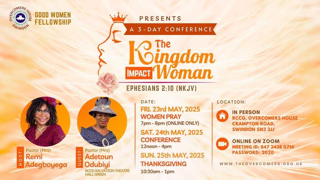 a three-day conference for women in Swindon and beyond organised by RCCG Overcomers House Women. Choose a Friday session Register to attend dinner on Saturday Dress code for Sunday: a […]