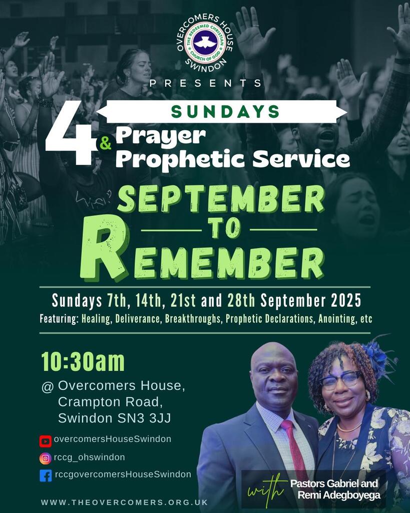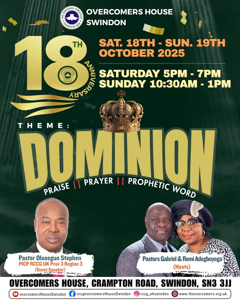 RCCG Overcomers House Swindon celebrates 18 years! Mark your calendars for the two-day programme – 18th and 19th October!